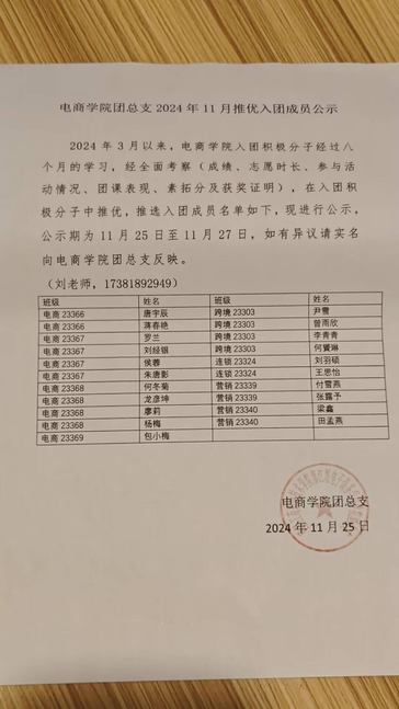 2024年3月以来,电商学院入团积极分子经过八个月的学习,经全面考察(成绩、志愿时长、参与活动情况、团课表现、素拓分及获奖证明),在入团积极分子中推优,推选入团成员名单如下,现进行公示,公示期为11月25日至11月27日,如有异议请实名向电商学院团总支反映。